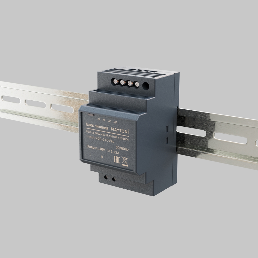 Источник напряжения PSL016-60W-48V-IP20-HDR с гальванической развязкой для светодиодных изделий, подходит для монтажа на DIN-рейку, благодаря стандартизированному креплению. Небольшие габариты позволяют размещать блоки питания в электрические щиты и ниши.