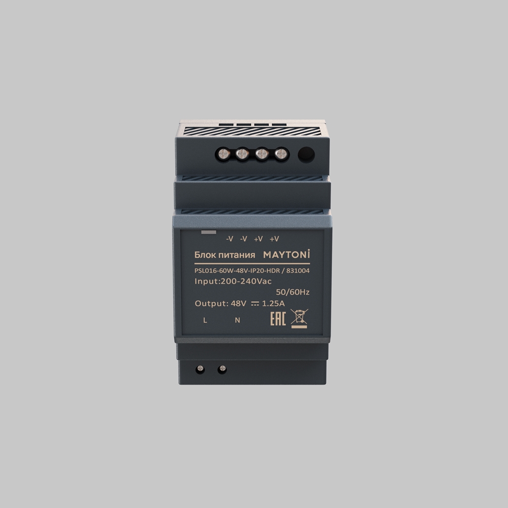 Пластиковый корпус, степень защиты от пыли и влаги IP20. Входящее напряжение 200-240V. Выходные параметры: напряжение 48В; мощность 60 Вт и ток 1,25 A. Коэффициент мощности PF>0,6. При подборе блока питания необходимо учитывать запас по мощности, составляющий 20% от суммарной мощности нагрузки. Гарантия 3 года.