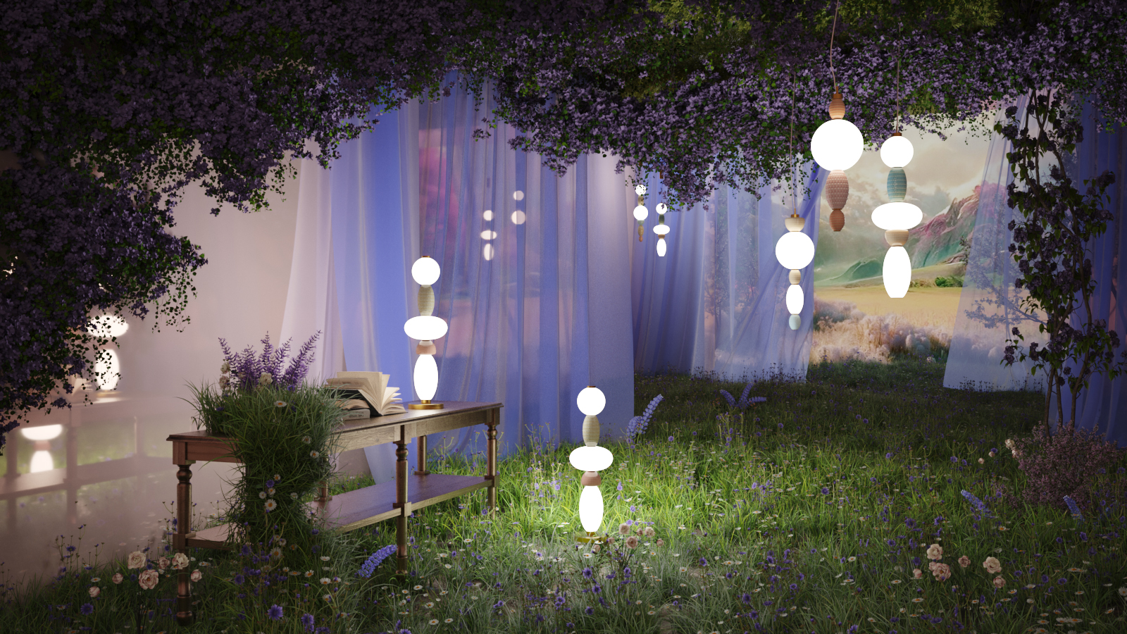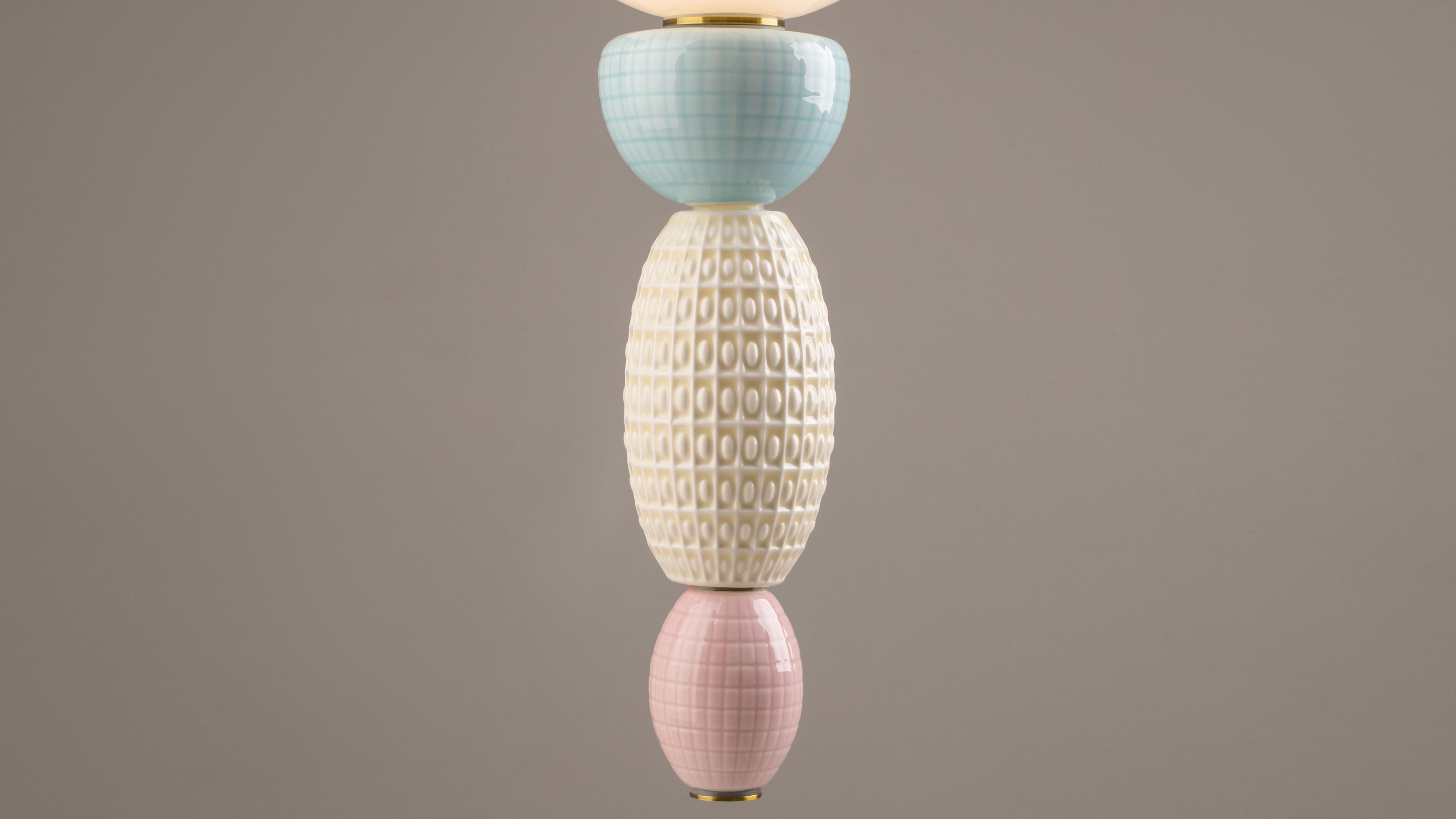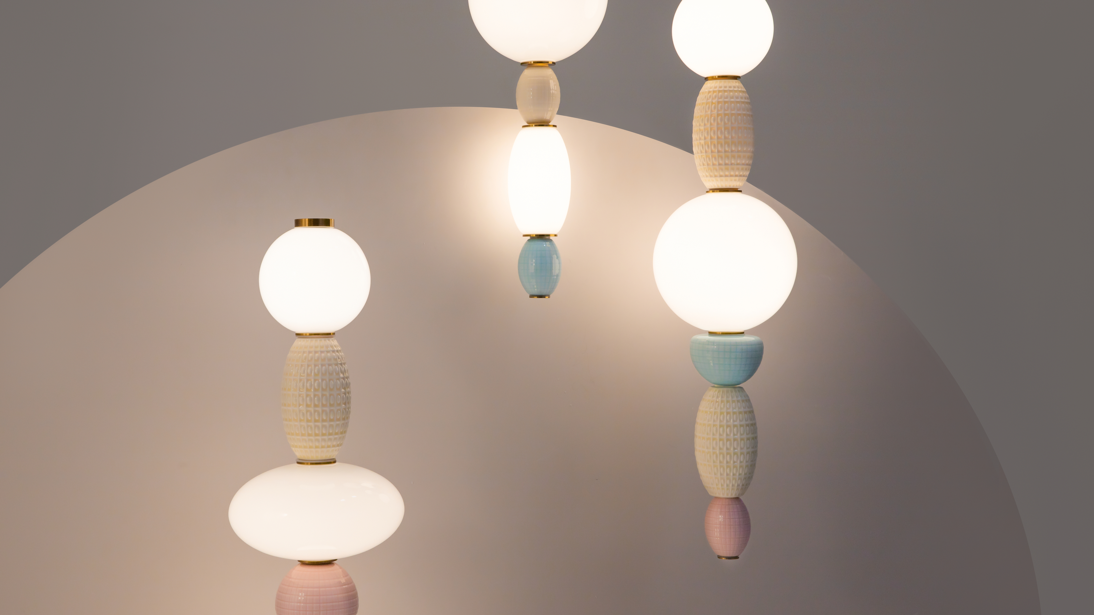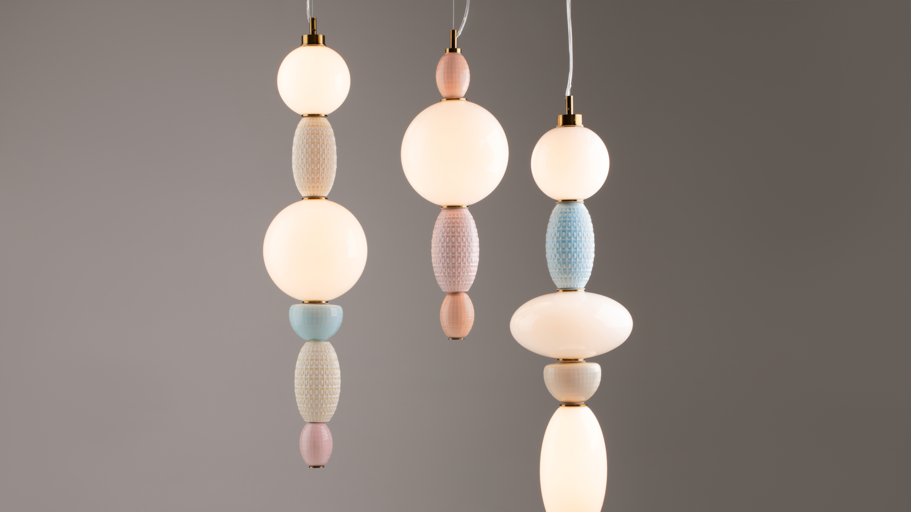 Благодаря плафонам из белого стекла с глянцевым финишем создается равномерное и приятное освещение вокруг. Цветные керамические