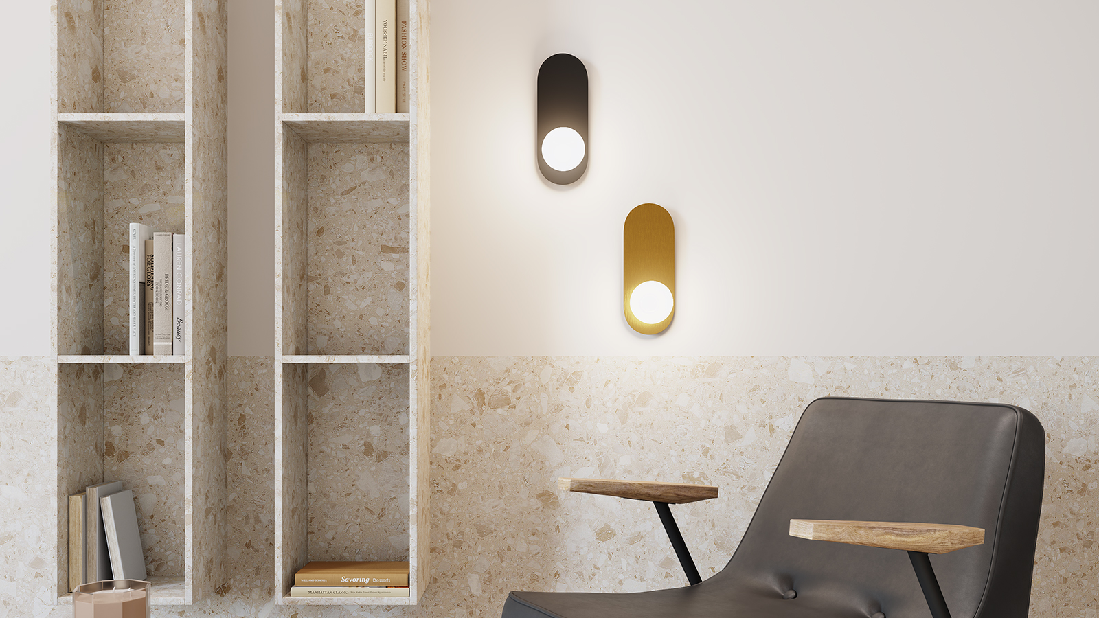 Маленькие круглые плафоны, выполненные из белого матового стекла, и тонкое металлическое основание в форме овала привлекают эстетической лаконичностью и функциональностью. Конструкция светильника обеспечивает плотное и аккуратное прилегание к стене. Светильники представлены в 2-х цветах: черный и латунь