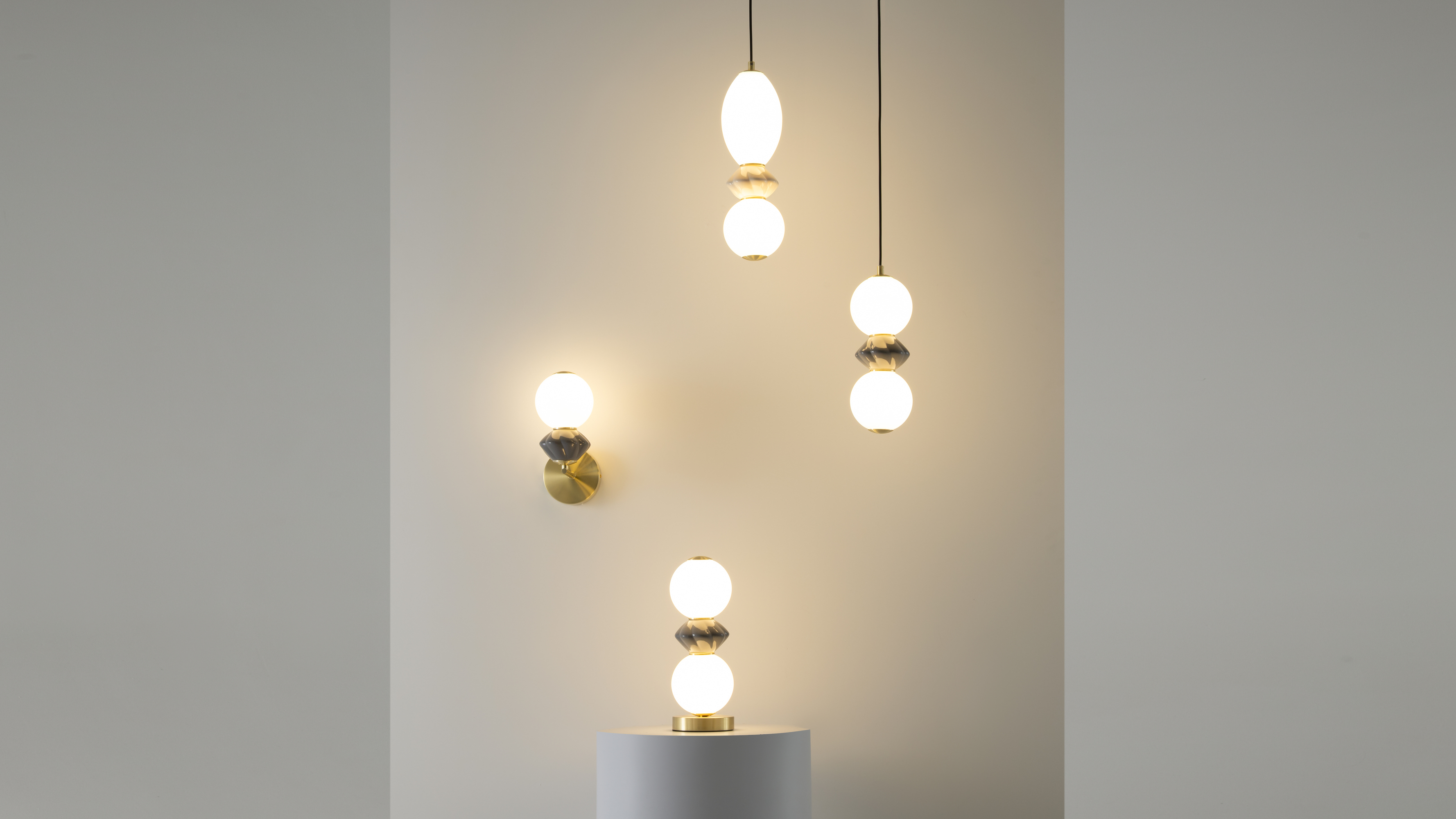 В серии представлены подвесные светильники двух типов, настенный светильник (бра) и настольный светильник.Уникальной чертой серии является декоративный элемент в виде фигурной бусины с вертикальным рельефом, изготовленной из натуральной керамики. Бусина покрыта глянцевой глазурью и доступна в двух цветовых решениях: кремово-белый (RAL 9001) и серебристо-серый (RAL 7001). В сочетании с металлической арматурой цвета сатинированной латуни и молочно-белыми плафонами из глянцевого стекла.