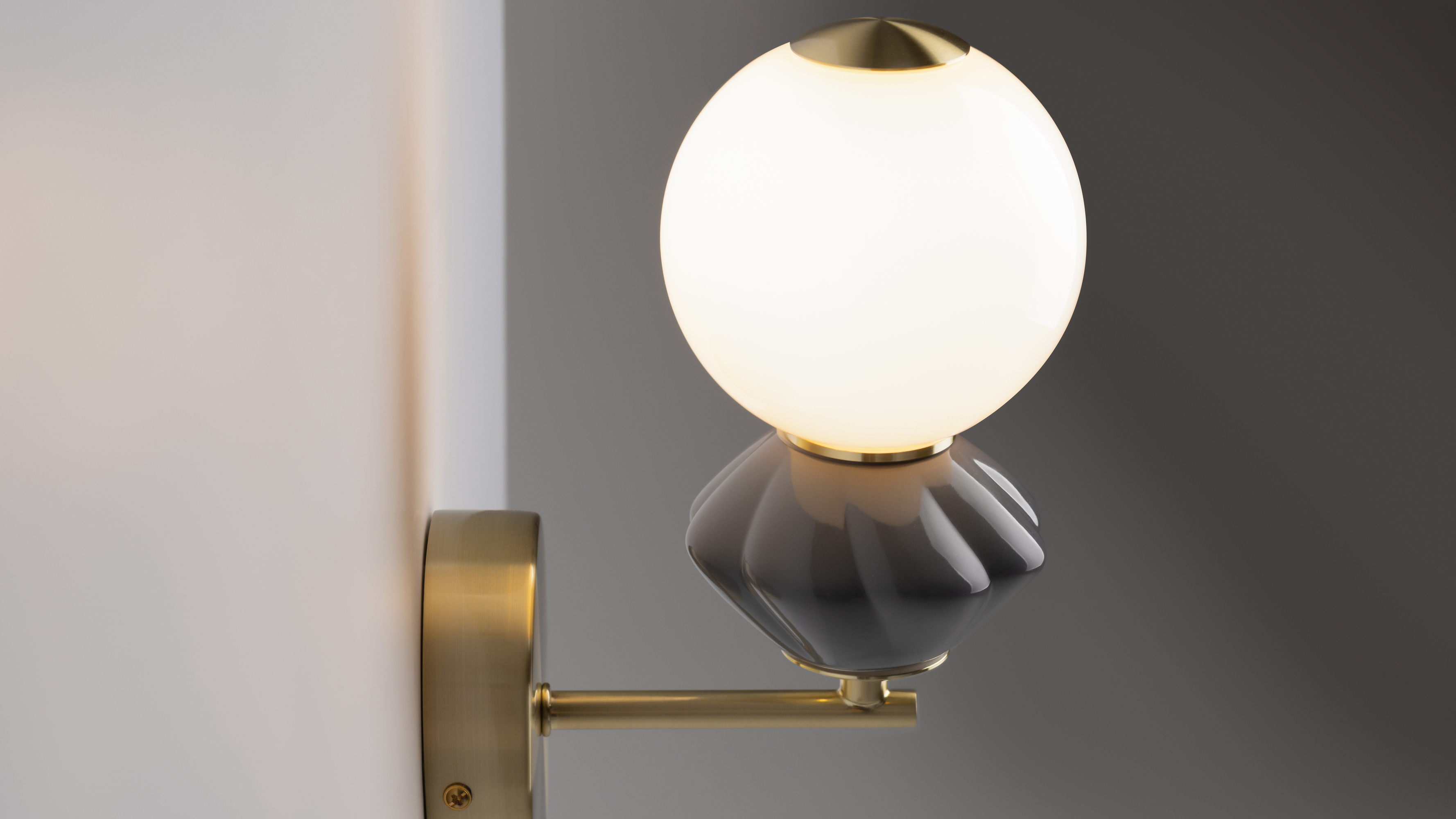 В сочетании с металлической арматурой цвета сатинированной латуни и молочно-белыми плафонами из глянцевого стекла керамика становится центральным элементом композиции и собирает текстуры в единую гармонию.