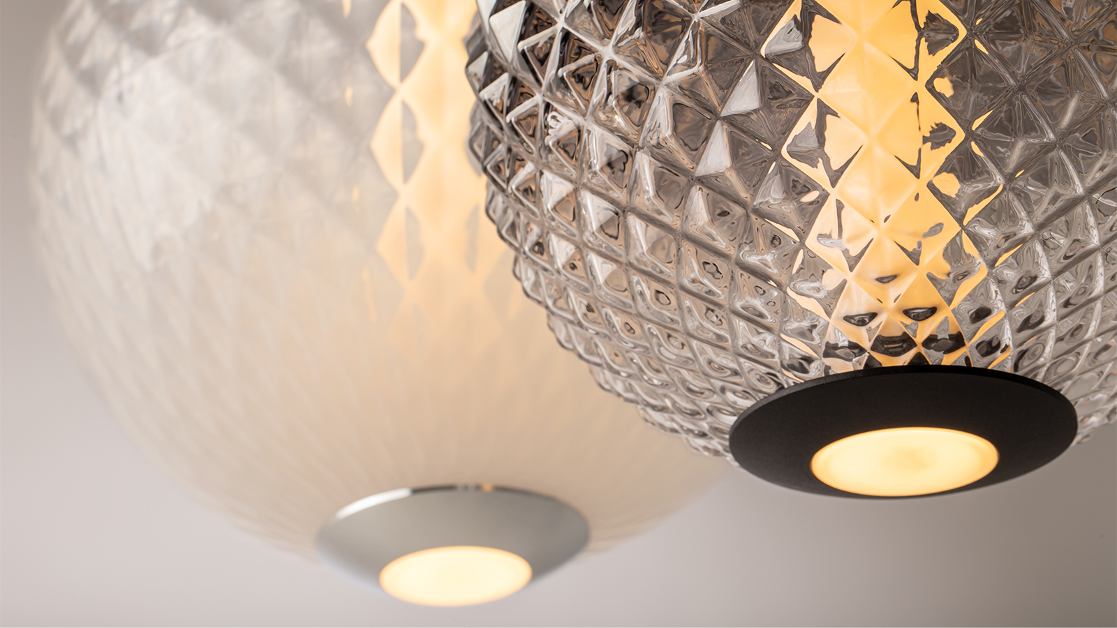 Серия представлена в двух цветовых решениях и формах: белый плафон, имеющий гладкую поверхность с нанесенным изнутри рельефом, и металлическая арматура цвета глянцевый хром; черный стеклянный плафон с наружным рельефом и арматура черного цвета с антибликовым покрытием. Плафоны сферической формы в трех вариациях.
