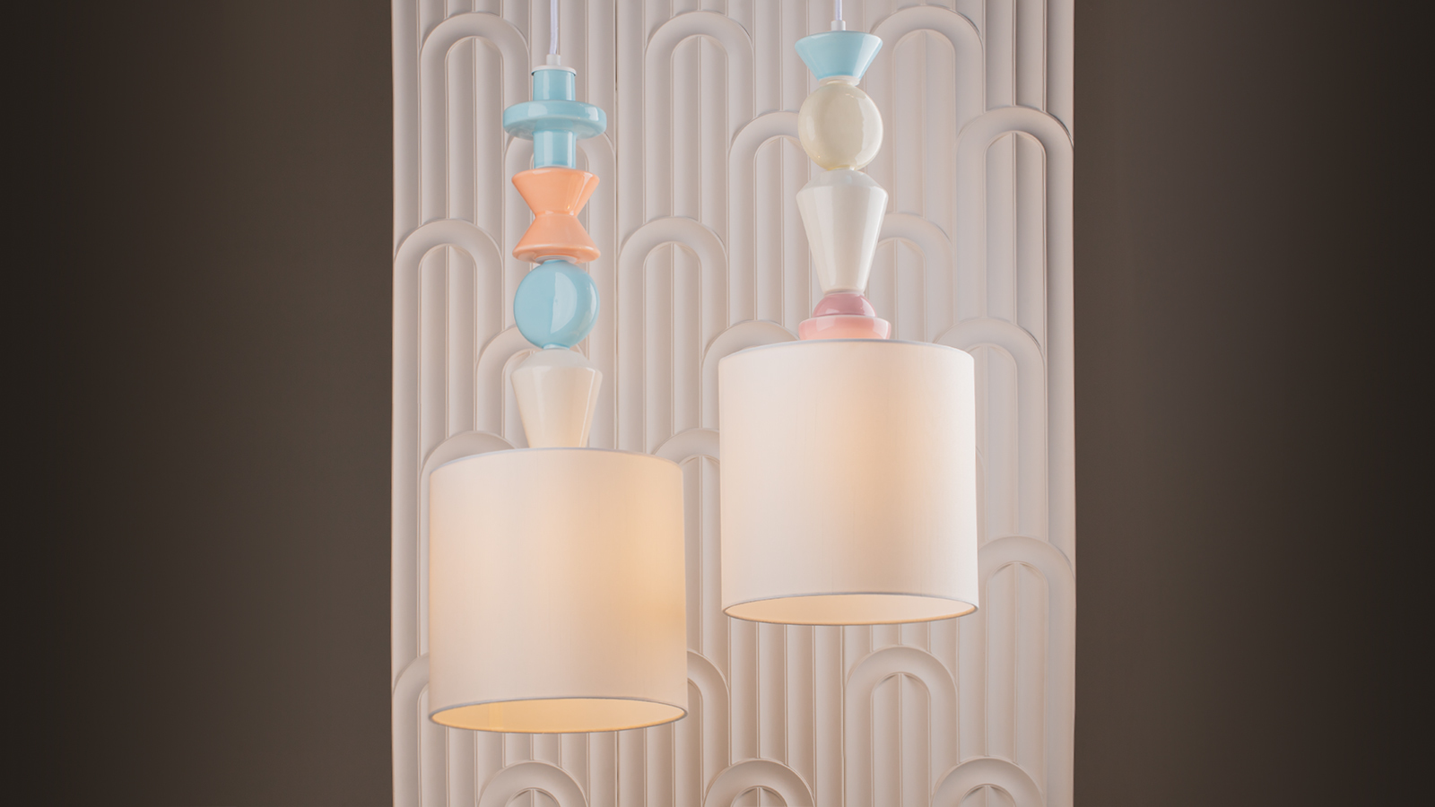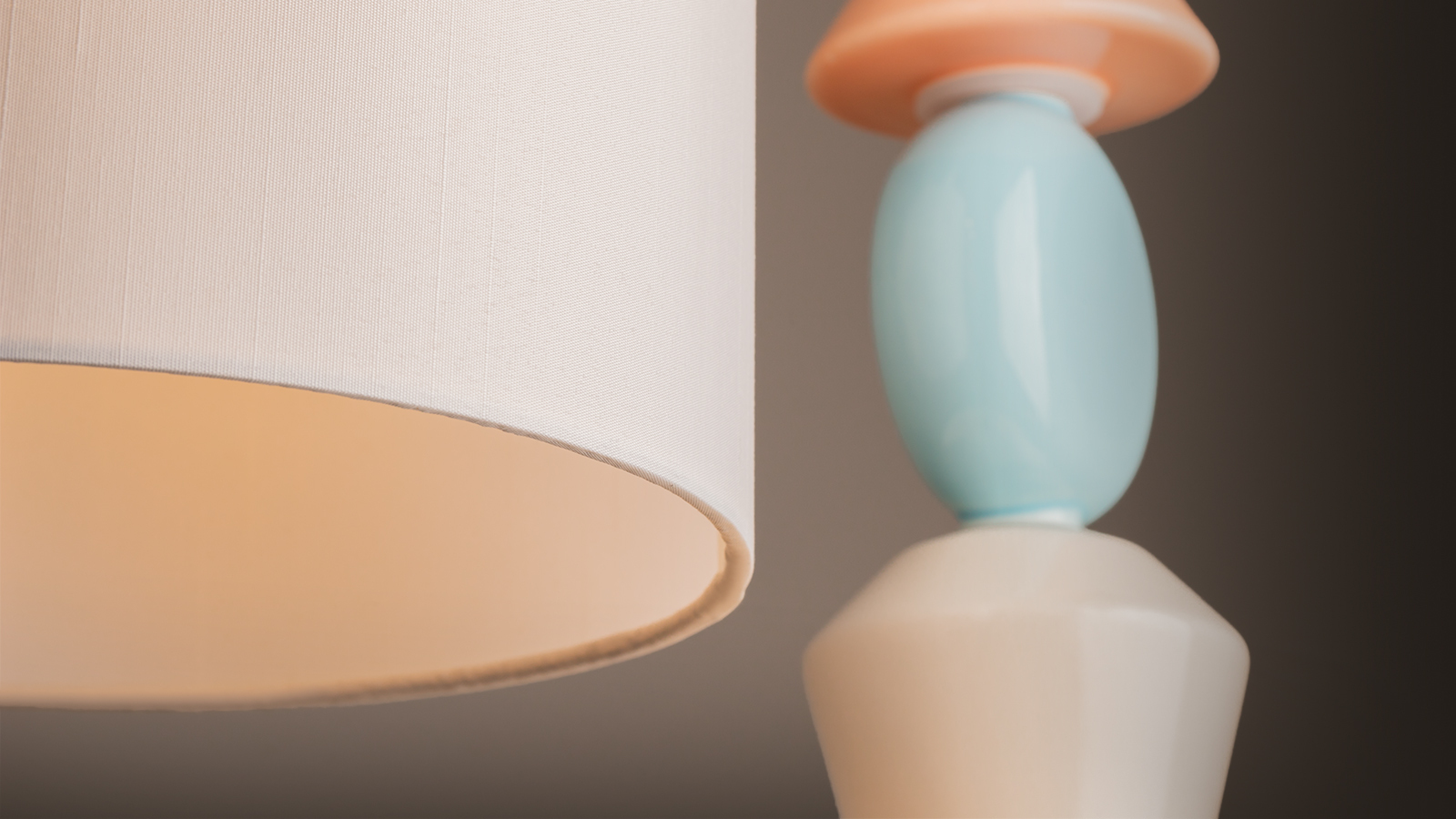 Белый абажур дополняют цветные керамические детали, контрастное сочетание оттенков хорошо смотрится и привлекает внимание. Светильник превратится в оригинальный акцент в интерьере.