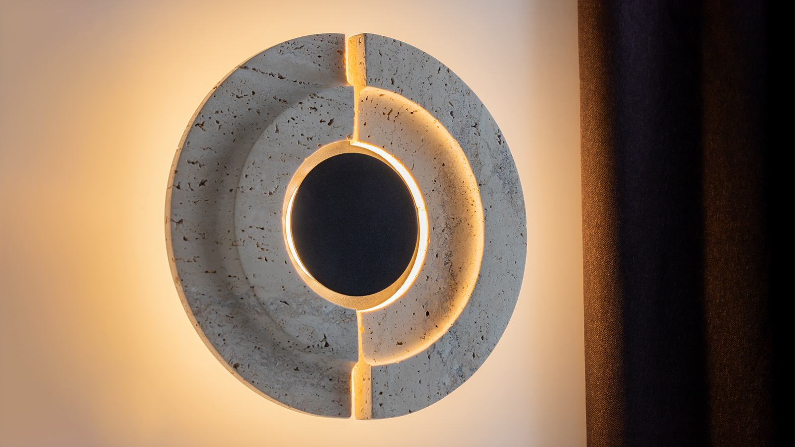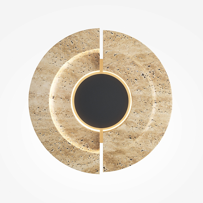 Центральным элементом дизайна стал травертин, чья пористая текстура и природный бежевый оттенок визуально отсылают к песчаным дюнам. Каждый светильник уникален благодаря сложному архитектурному рельефу на срезе натурального камня. LED-источник света с температурой 3000К обрамляет и подсвечивает внутренние грани травертина, а также создаёт мягкий световой ореол на стене, усиливая эффект глубины и таинственности.