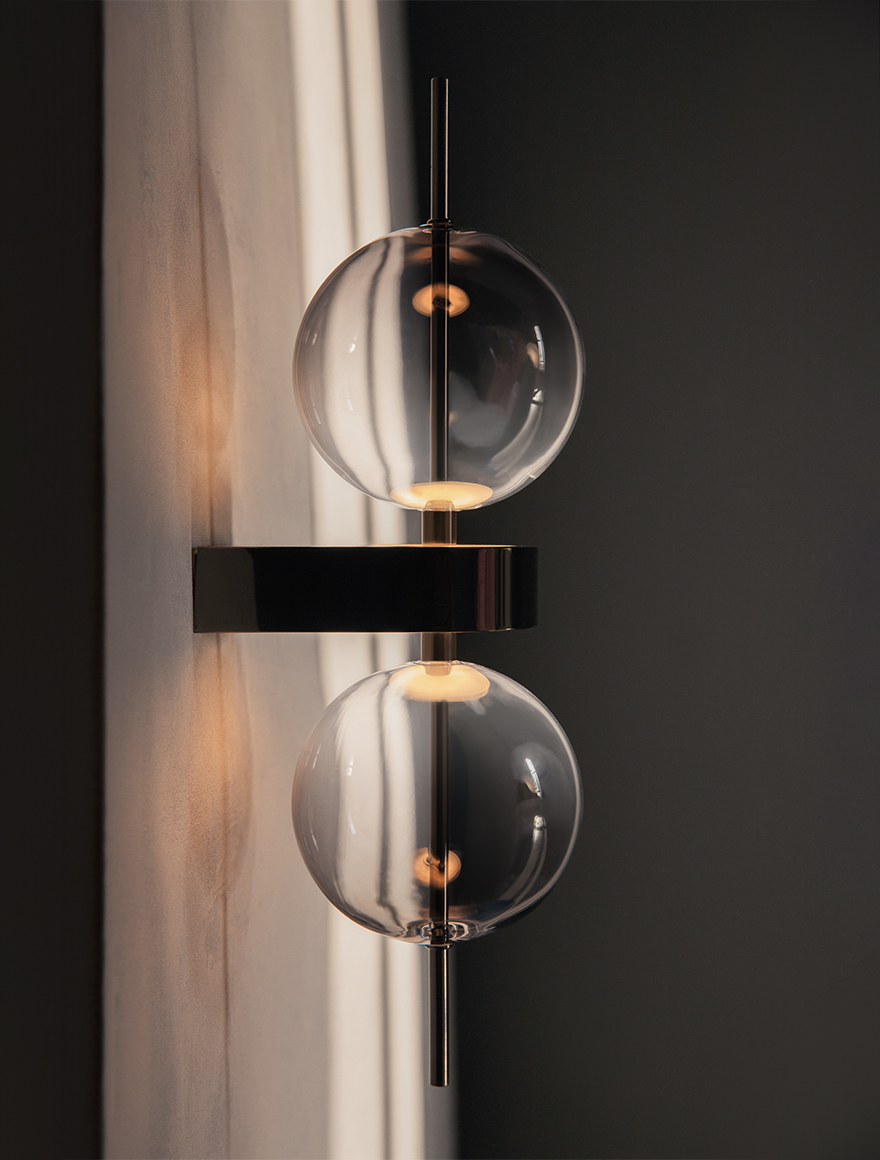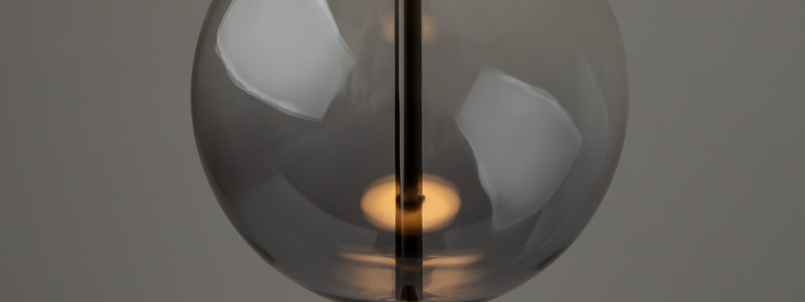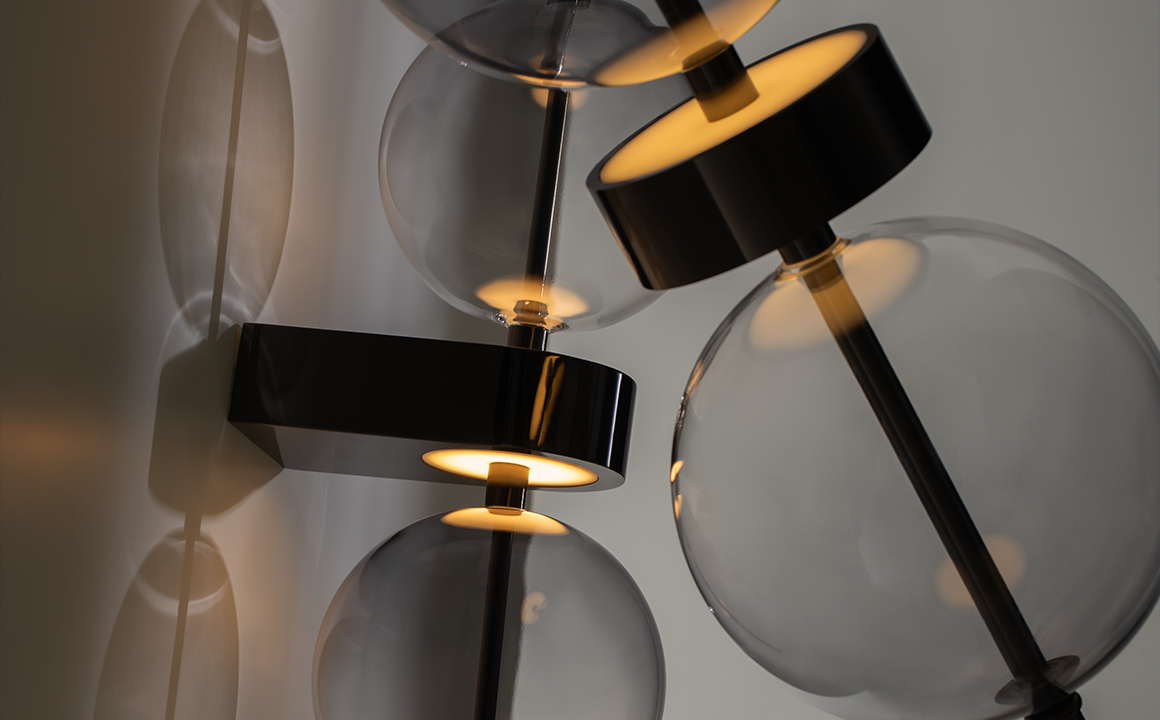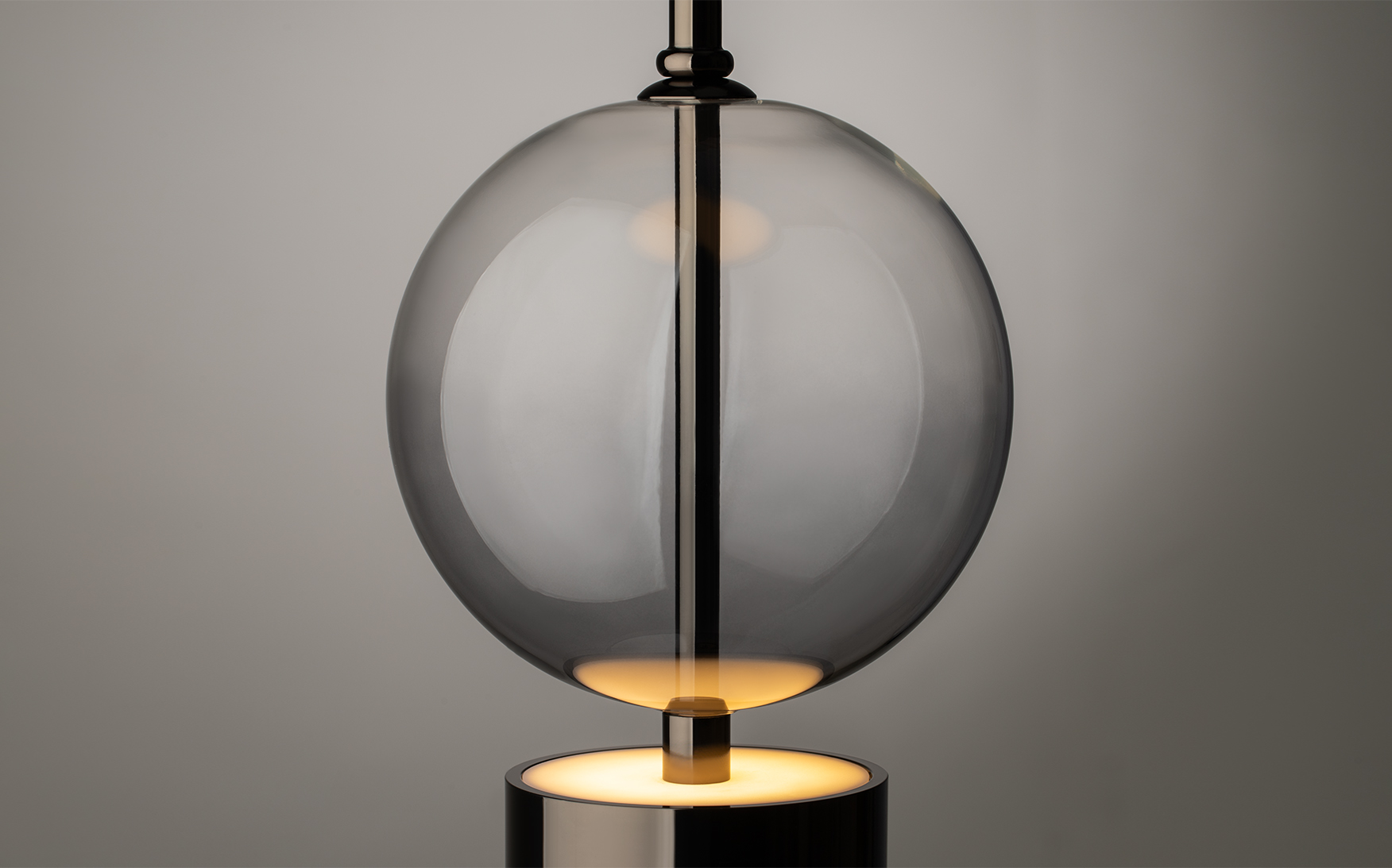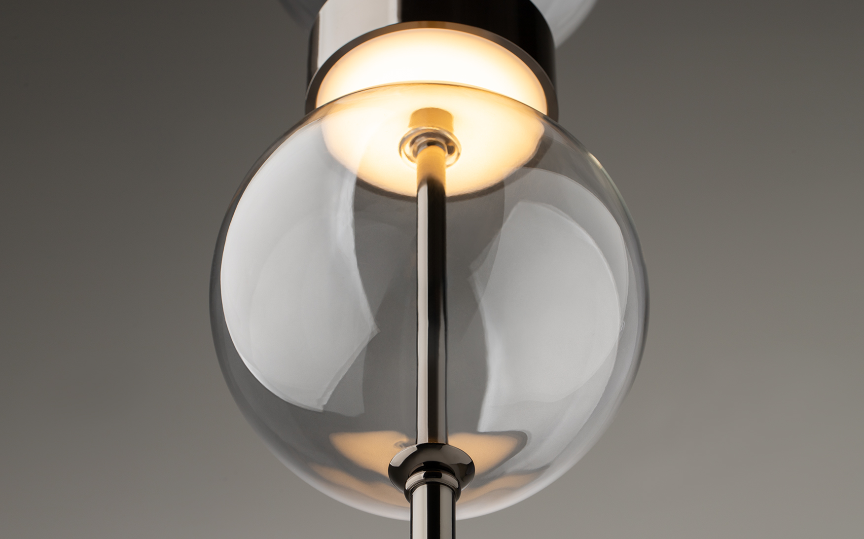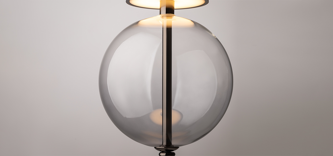 Основной акцент серии - стеклянные шары с тонированным зеркальным градиентом, сияние которых подчеркивает черная глянцевая арматура.