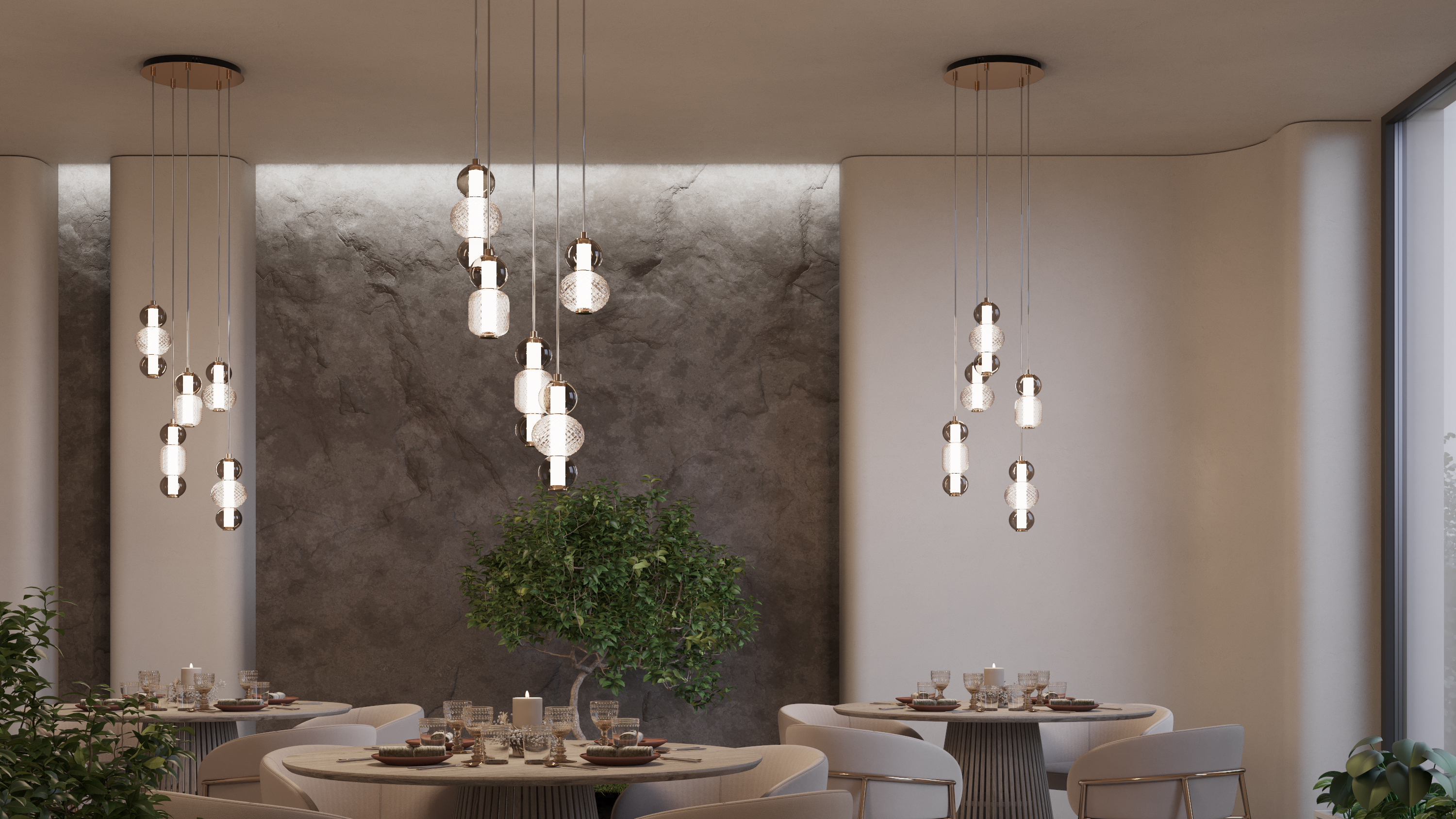 Яркий свет, исходящий из плафонов похожих на капли воды, создает водопад разноцветных бликов.