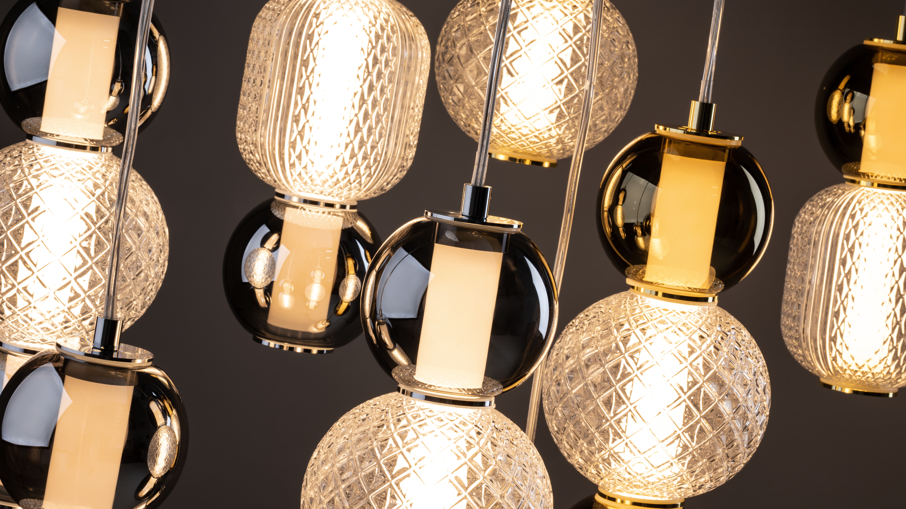 Уникальная коллекция разнообразных подвесных и потолочных светильников. Плафоны, похожие на капли, источают интенсивный свет и создают водопад разноцветных бликов. В серии представлены одинарные подвесные светильники, потолочные светильники, а также композиции из 3 и 5 подвесов.
