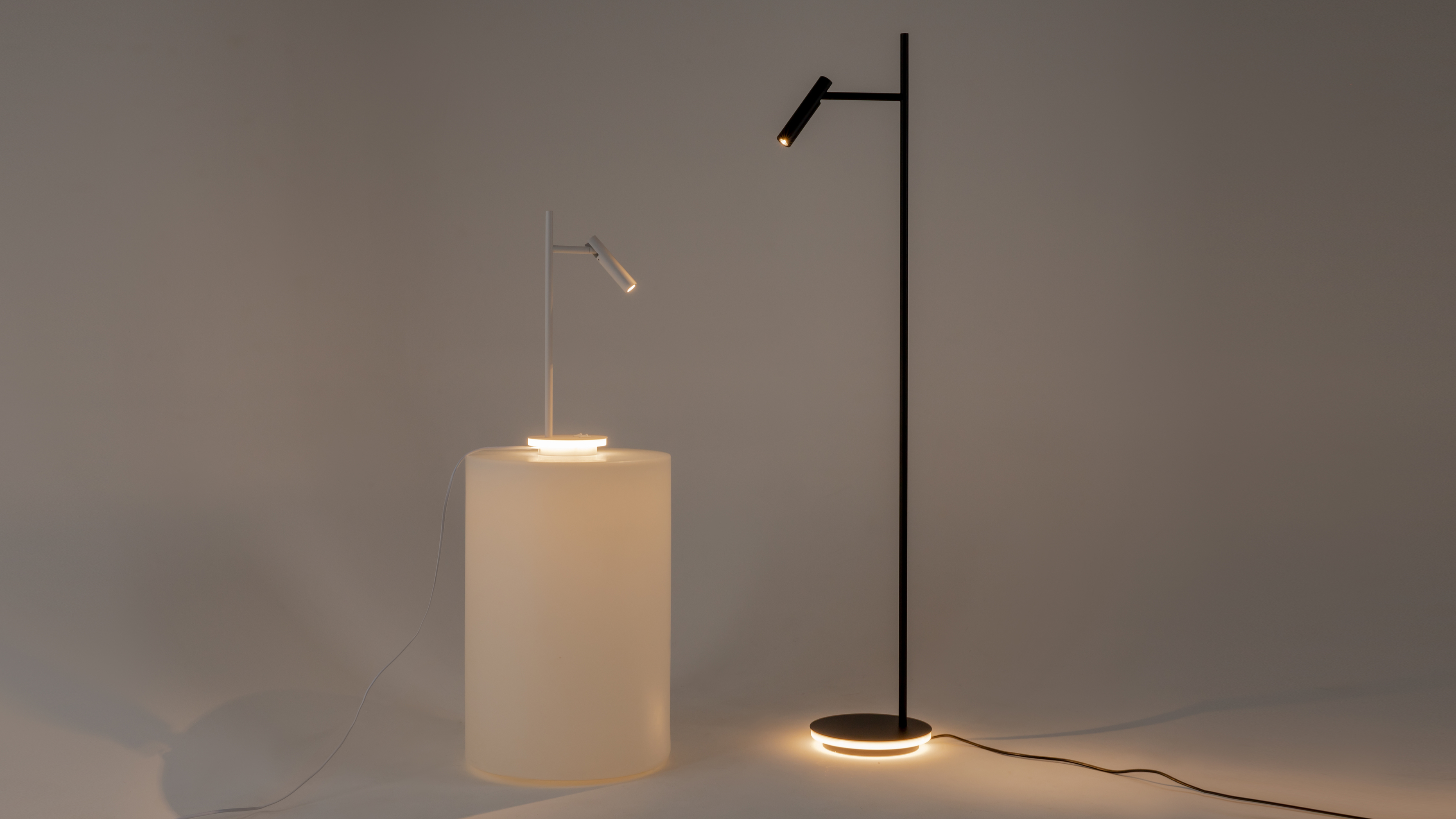 Многофункциональные светильники серии Estudo с декоративной подсветкой основания. Благодаря вращающемуся плафону-цилиндру регулируется направление светового потока. Модели серии доступны в двух цветах: черном и белом.