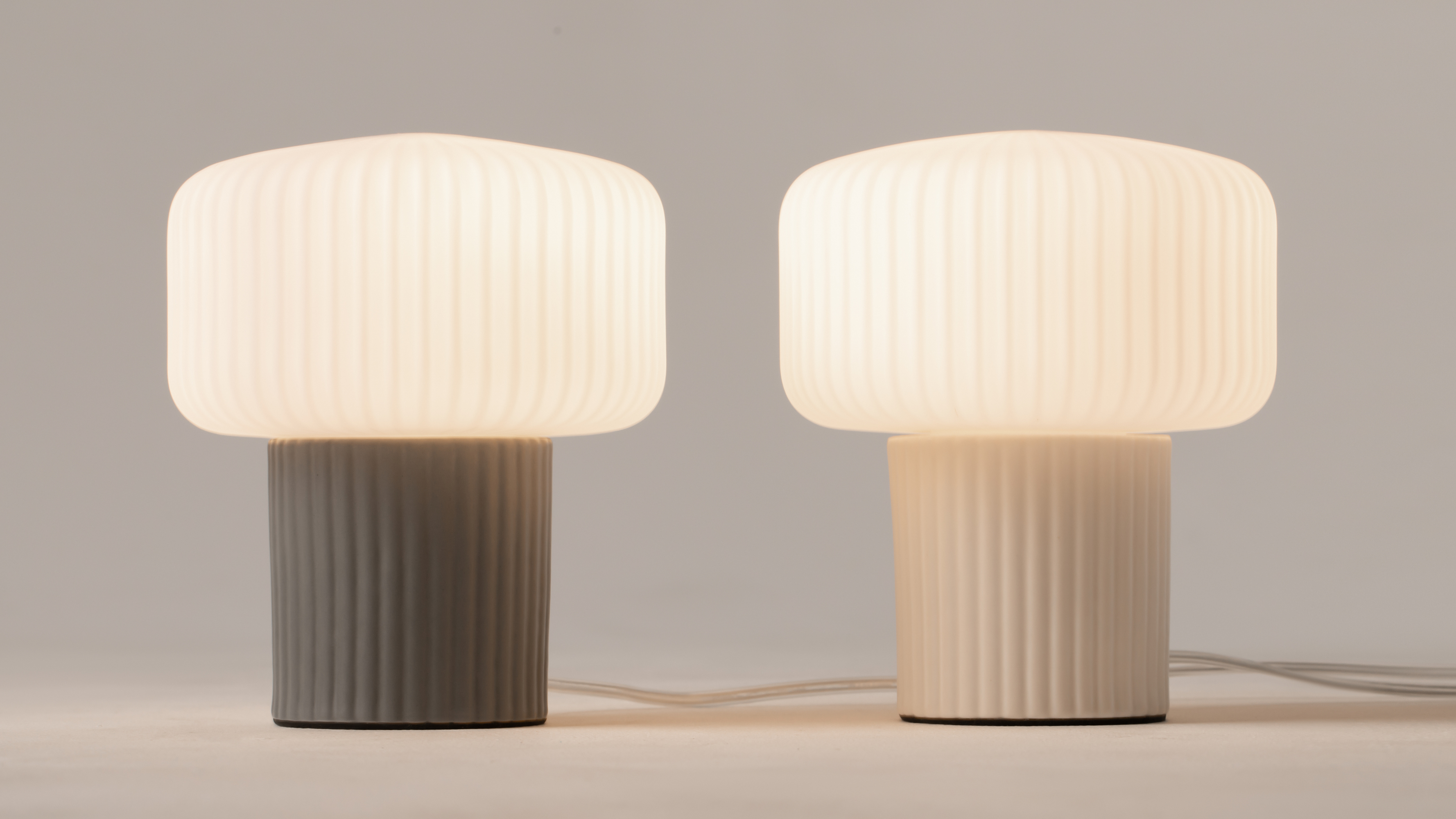 Керамическое основание и стеклянный плафон украшены аккуратным вертикальным рельефом, который станет деликатным акцентом в интерьере и привлечёт внимание. Сочетание белого матового стекла плафона и керамического основания, покрытого матовой глазурью, формирует тактильную и визуальную эстетику. В серии представлены два пастельных оттенка керамики: кремово-белый (RAL 9001) и серебристо-серый (RAL 7001).