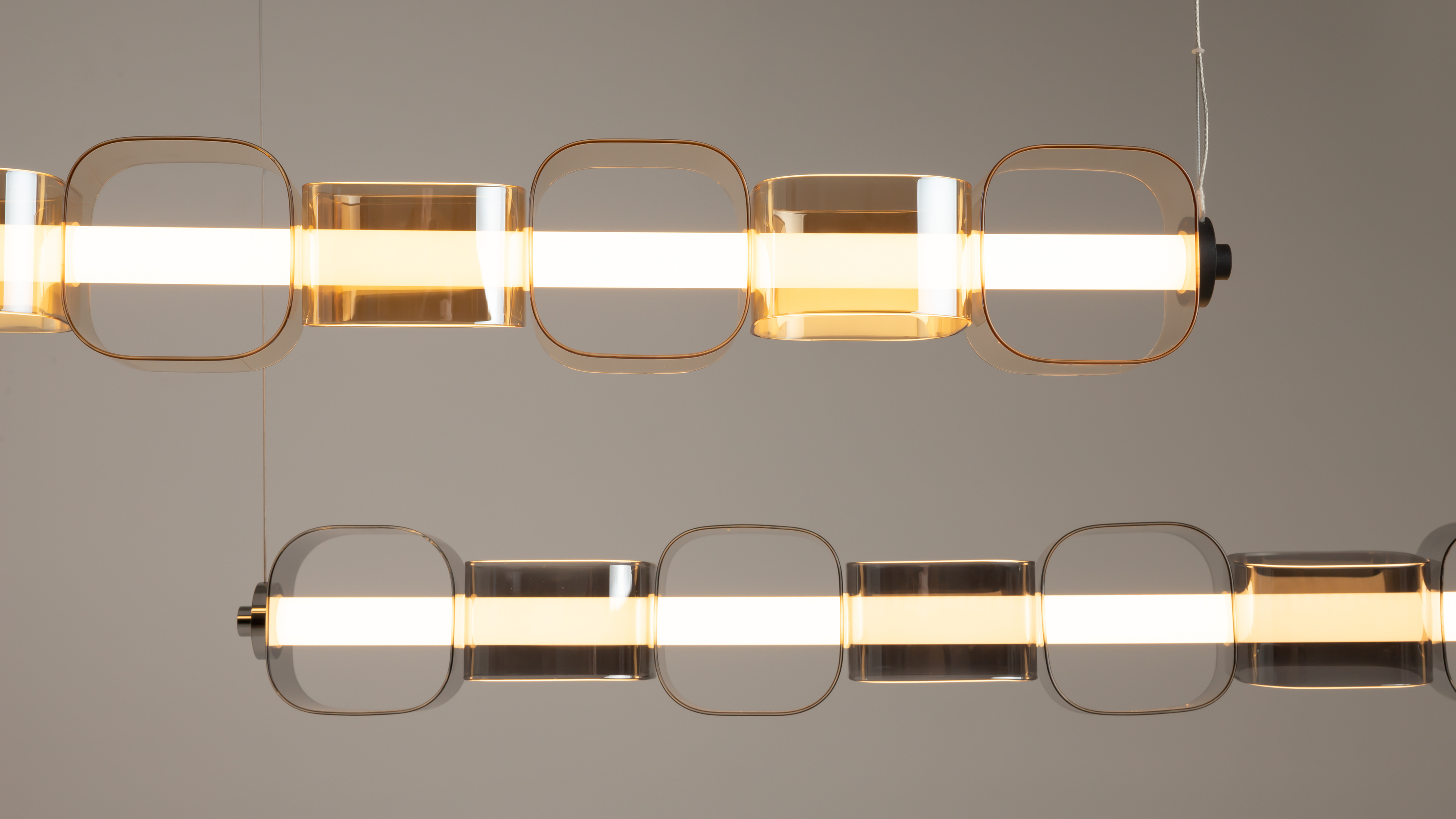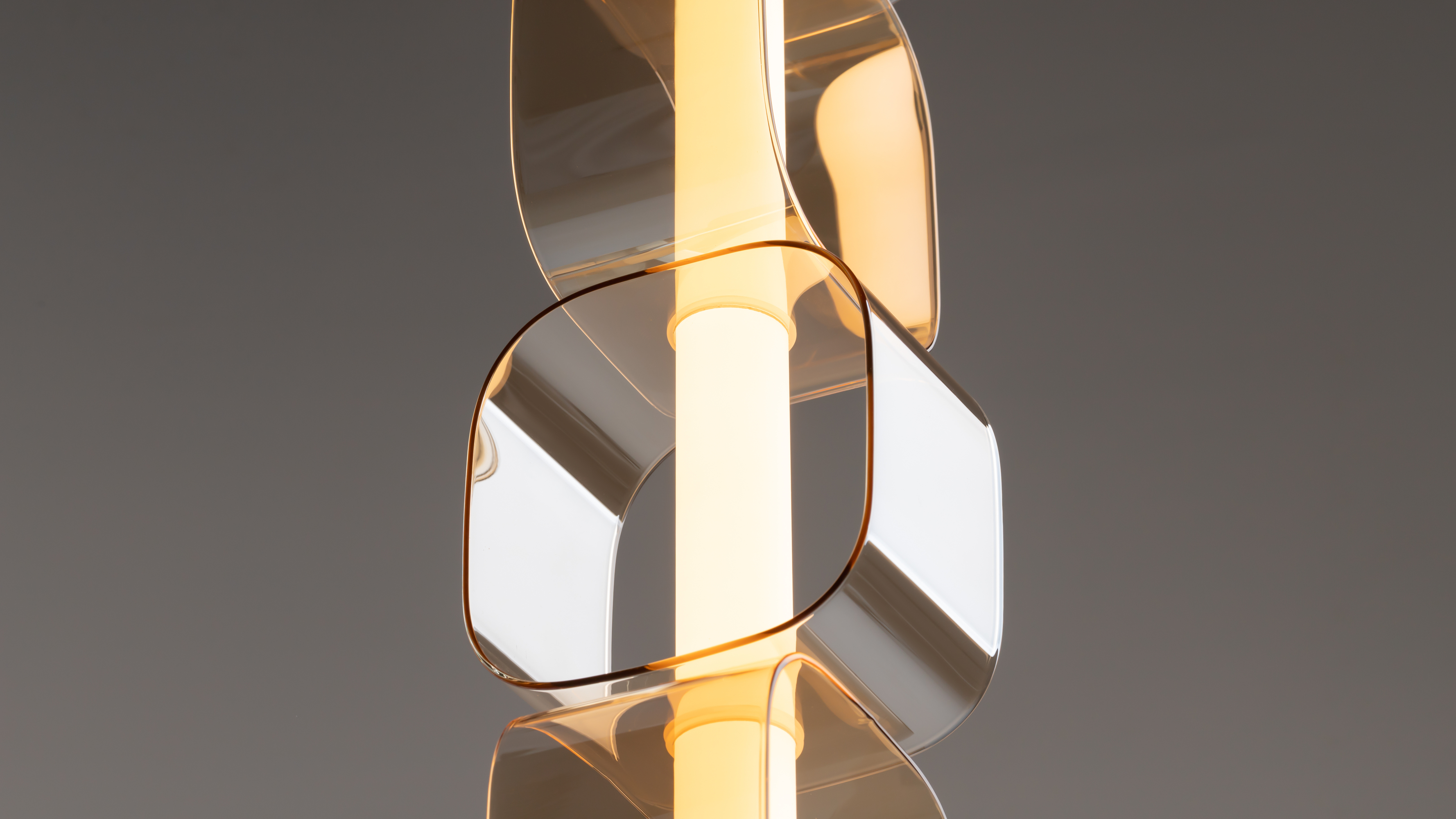 Серия представлена вертикальными и горизонтальными светильниками, доступными в двух цветовых решениях. Тонированные стеклянные плафоны в сером и янтарных тонах. Контрастная арматура в глянцевом хроме или черном цвете с сэнди-эффектом подчеркивает ультрасовременный характер.