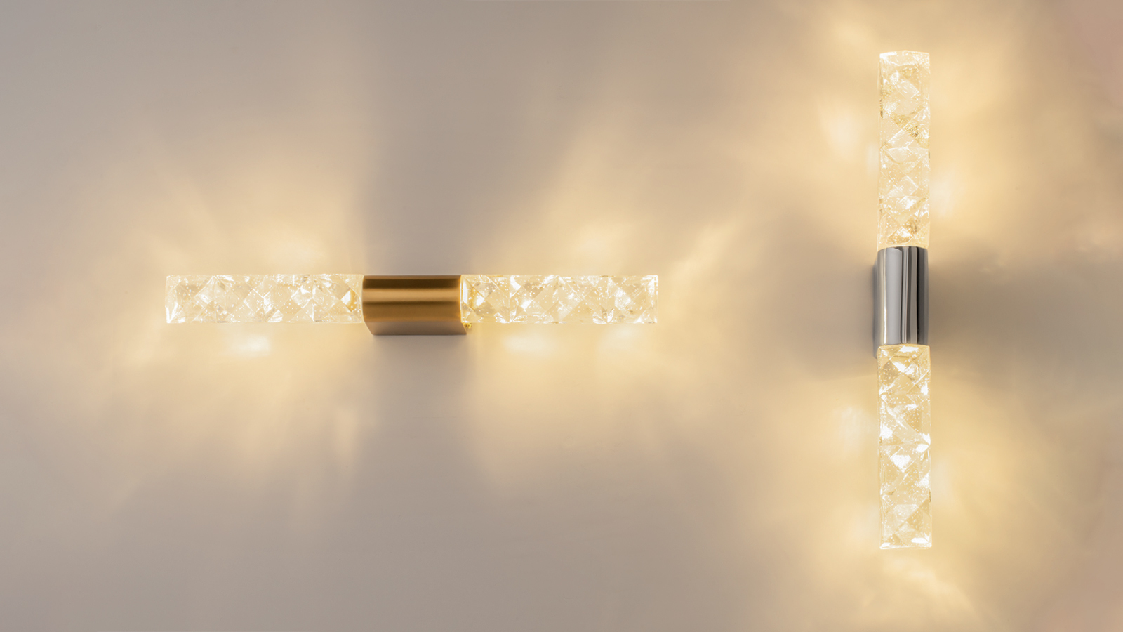 Рельефные хрустальные плафоны с изысканным зигзагообразным орнаментом хорошо освещают пространство, создают на стенах живые, геометрические световые узоры, превращая каждый уголок в сцену для незабываемого праздника жизни. Доступные в двух классических цветах — сияющем хроме и теплой латуни.