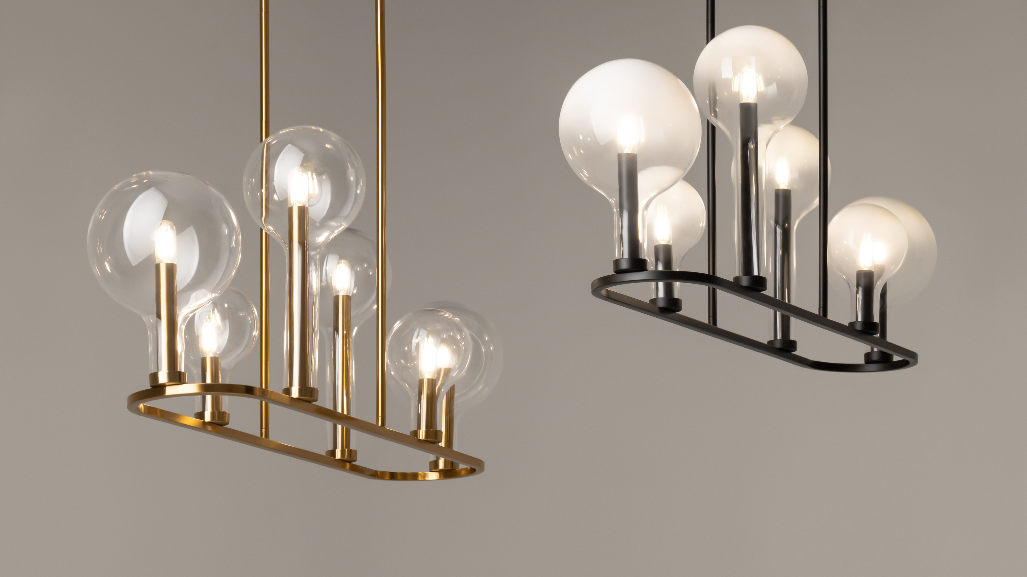 Модели представлены в двух цветовых решениях, которые легко приспосабливаются как к технологичному минимализму, так и незыблемой классике: черная арматура и белые градиентные плафоны, арматура в цвете латуни и прозрачные плафоны.